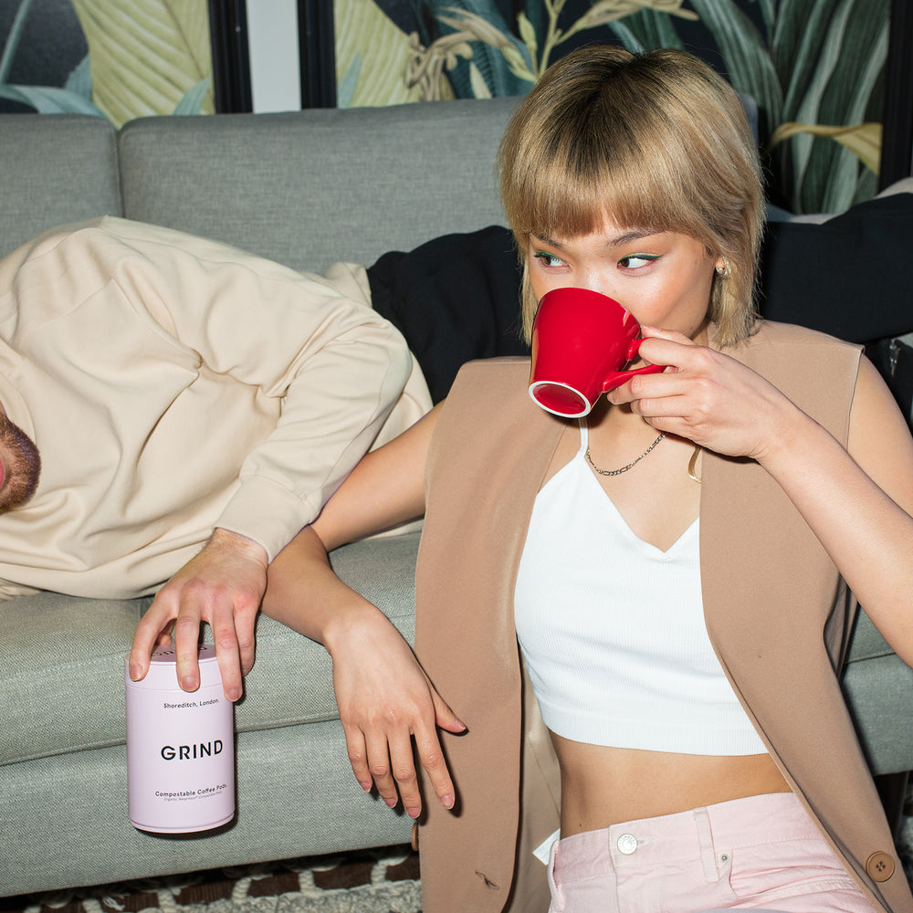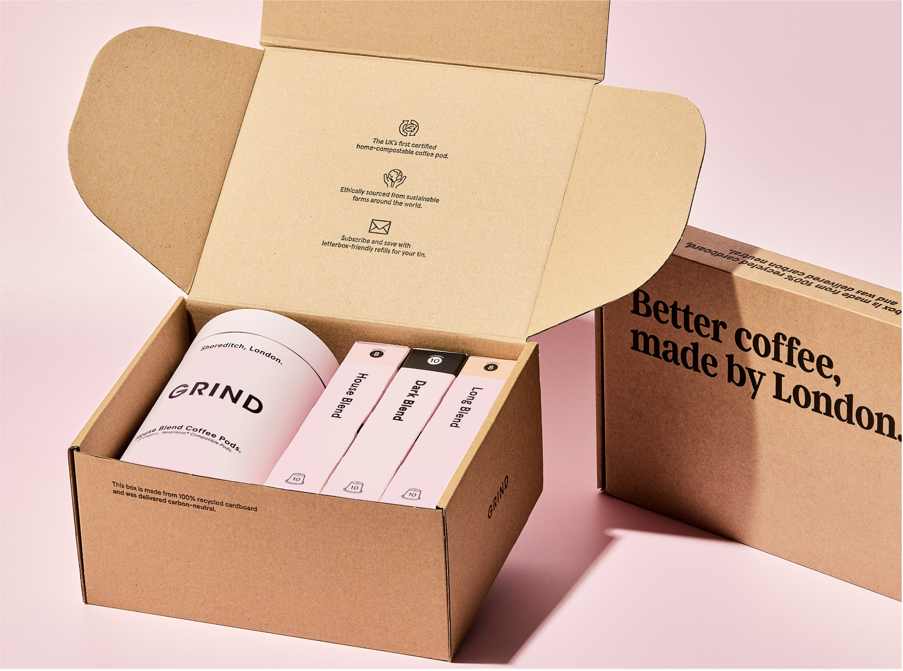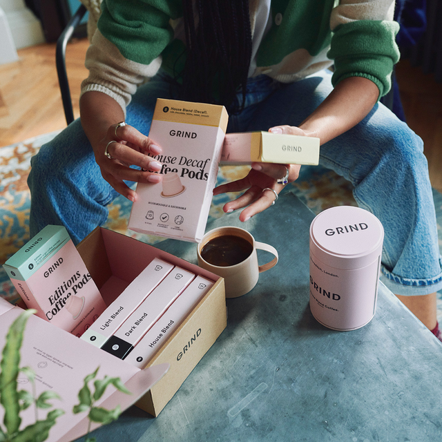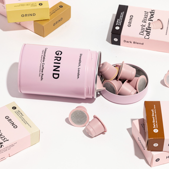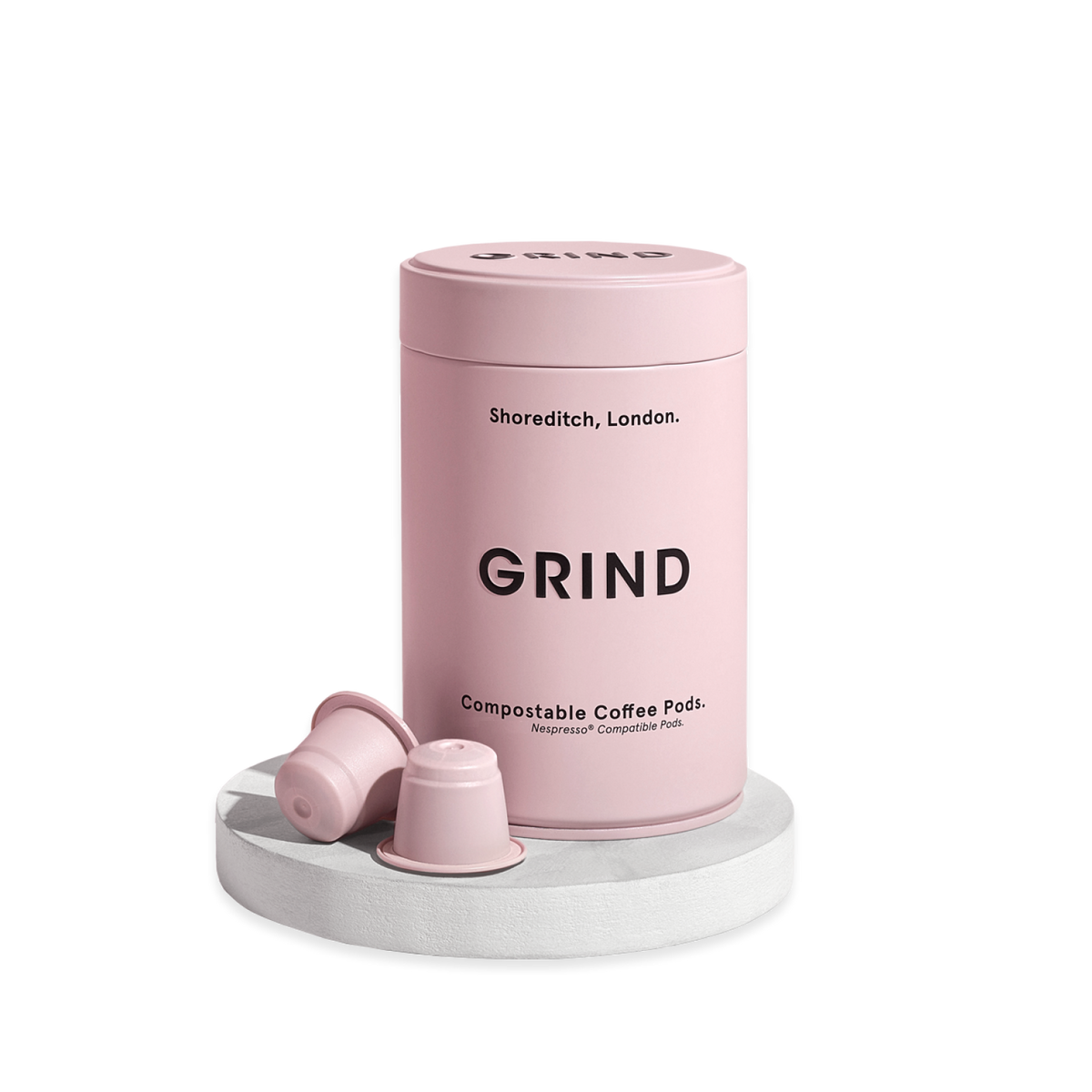 Get started with 30 home-compostable pods for £10.46, with a refillable pink Grind tin and free shipping.