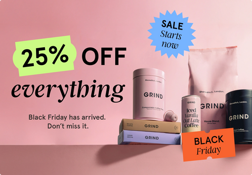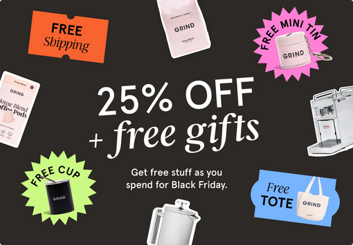Your free gifts will be added to your basket automatically when you reach the spending threshold for that gift: you’ll need to spend £30 to get free shipping, £50 to get a free mini tin keyring, £70 to get a free Grind tote bag, and £100 to get a free black reusable Grind cup.