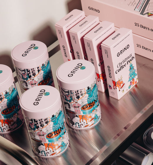 Featuring a festive illustration of the Grind Grotto (our Bermondsey roastery), our new Christmas Tin comes with 20 Nespresso® compatible compostable coffee pods in the blend of your choice.