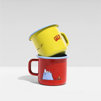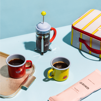 And these coffee cups are pretty magical: they're the same ones we use in all our cafés, designed so you can bring the Grind experience home with you. One cup features Sophy Hollington's iconic moon phase illustration, one features her red trademark.