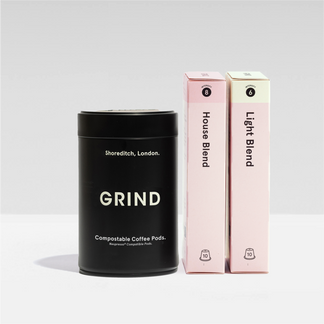 Get 20 home-compostable coffee pods with a sleek refillable silver Grind tin.